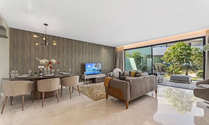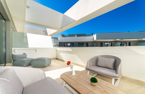 Very Modern and Upscale, 3 bedroom spacious townhouse with Private Heated Pool in the heart of the famous La Cala de Mijas, just a 5 min. walk to the beautiful La Cala beach. House is stylishly decorated and very well equipped. Spectacular communal garden facility with 2 saltwater communal pools and a children's pool. On the main level you will find a spacious Living/Dining room with a guest bathroom and an open concept fully equipped modern kitchen with a breakfast bar. Wall to wall glass sliding doors will lead you to the private terrace with direct access to a beautiful community garden and pools. Stylishly decorated living room has a large Smart TV with hundreds of international channels. The 2nd level of the house offers a Master bedroom with ensuite, built in wardrobe and private access to the spacious outdoor terrace with amazing views. the 2nd. and 3rd. bedrooms have full privacy and a shared bathroom. The 3rd level of the house has a big outdoor roof top with an outdoor kitchen, BBQ Grill, dinning ,outdoor shower, sun bathing area and a small heated pool. In the lower level you will find a laundry room with the washer, dryer and direct access to the garage with the private parking space.