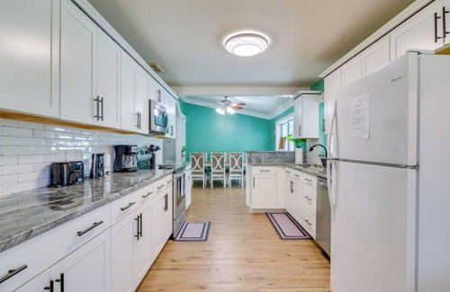 Cook, gather, and connect in this bright and inviting kitchen and dining area. You’ll love preparing meals in the fully equipped kitchen featuring granite countertops, stainless steel appliances, and all the essentials you need. Enjoy coffee at the breakfast bar or host a family-style dinner at the spacious dining table that seats eight. The vibrant teal walls add a splash of character, making mealtime feel cheerful and memorable. Whether you’re whipping up a quick snack or a full holiday feast, this space makes it easy and enjoyable.