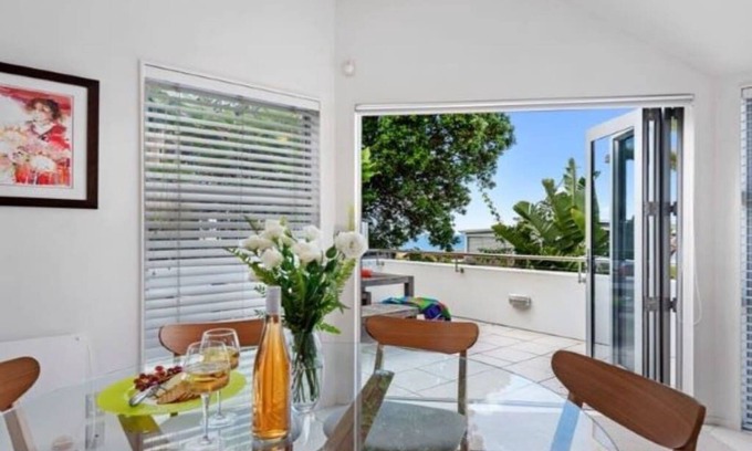 On the upper level, you will enjoy the generous living/dining / kitchen area with bi-fold doors opening on to a patio for alfresco dining and partial ocean views. The master bedroom is on the top floor, with a queen size bed and en-suite bathroom and walk in wardrobe. Wake up and step out onto your private patio to enjoy your morning coffee.