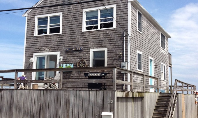 Ocean Front House on Sand Hill Beach. Beautiful views in every direction, Ocean on the back deck, and Scituate Harbor on the front deck. Large wrap around deck, stairs to beach, barbecue, and family entertainment. Nice sandy beach for kids to swim, no undertow, both public beach and private beach. Minutes from Scituate Harbor restaurants and shopping, many options. If your interest in visiting Boston for the day, we have a local commuter rail that will get you into Boston in 50 minutes.