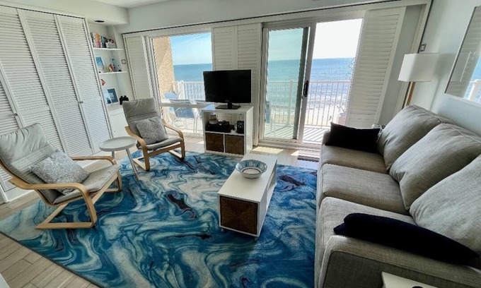 This Oceanfront colorful efficiency condo is on the 6th floor of Star of the Sea. Queen size Murphy bed and New 2023 queen size sofa bed. Room divider. Fully equipped kitchen. Outdoor pool/Sundeck. 2024 Smart TV with the main streaming apps loaded, Guests will be able to log in to their own accounts for streaming. Fun Park, miniature golf, bike rentals all within walking distance as are many restaurants and shops. Keyed entrance to building. Onsite laundry facilities. Parking garage underneath the building off of Brooklyn Street and outside parking deck off of Laurel Street. Two elevators. Free wireless internet. On-site manager. The beach and boardwalk are right outside. Relax on the private balcony and enjoy spectacular views.