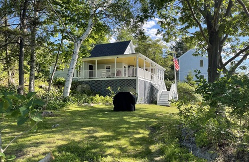 Beautiful Maine cottage with extra large porch with rocking chairs and 200 degree views of Casco Bay. Charming 2 bedroom with one bath. Sun room with pull out couch for 3rd sleeping area. Fully equipped kitchen. Abutting sister cottage at 61 Evergreen Landing.