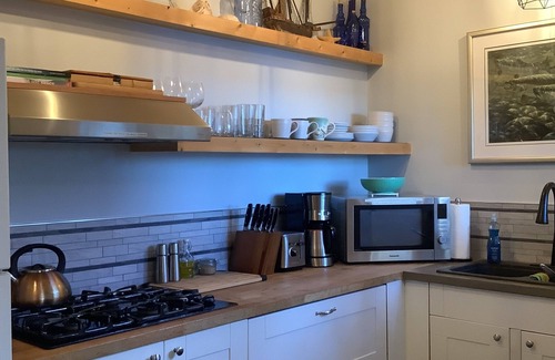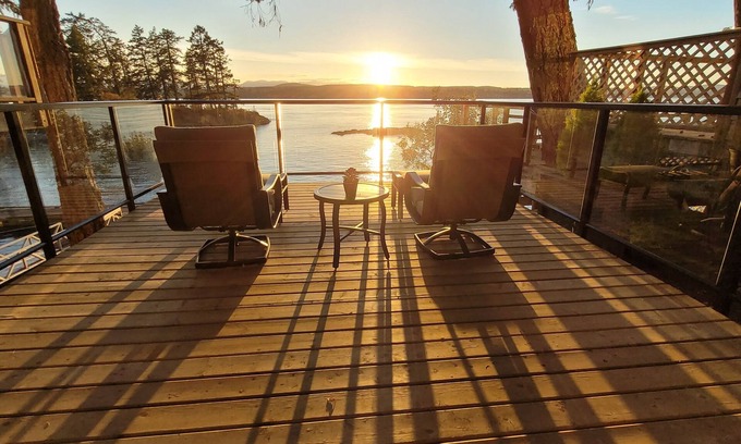 We have a 180 degree West facing view on the ocean, with your own private deck, plus patio and green space. Close to all amenities about a 4 min drive to the ferry. Our guest suite is separate from our main house and has a fully equipped kitchen, cozy living room, indoor and outdoor dining space with a bbq, washroom/laundry room. We also have storage for your bikes and kayaks.