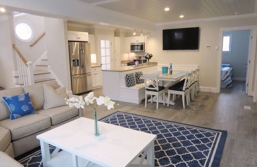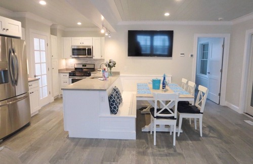 As the sun sets over the bay you are in for a real treat! Spectacular sunsets are a perfect way to end the day. Head back to the house and enjoy a Cape Cod tradition, just around the side of the house you will find the enclosed outdoor shower with hot and cold water. For your convenience, enter the house right there through the side door where you will find a half bath. The open floor plan and coastal decor will add to your experience of staying at the beach. There is a large, L-Shaped, cozy couch along with a 60 inch flat screen TV. Whether you take in your favorite show or the view of the water, you are sure to be happy! The kitchen is fully equipped with stainless steel appliances and a gas range. Family gatherings are made easy with a built-in dining table that seats 8. The main floor also offers a Bedroom with a Queen bed and en-suite bathroom with a shower. There is a 40 inch flat screen TV for your enjoyment.