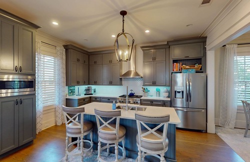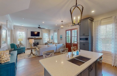 With decor inspired by the colors of the sea, Ocean Hues is a beautifully decorated, restful retreat where you can enjoy spending time with family and friends. With accommodations for eight people, Ocean Hues offers two master bedrooms with one upstairs and one downstairs. This lovely home features a fully equipped kitchen and includes a well-stocked spice cabinet. The custom dining table seats 12 people where you can enjoy meals with your whole family, play board games, and work on a jigsaw puzzle all week. The upstairs game cabinet is stocked with classic board games and puzzles. This Smart home has a Sonos sound system equipped with an Echo “Alexa" voice-activated assistant in the family room, master bedroom, upstairs loft and screened porch. Download the Sonos app on your phone or iPad to listen to your own playlist or ask Alexa to play the style of music you enjoy. Smart TVs are located in the family room, upstairs loft and screened back porch. The screened porch also features a lovely tabby fireplace. Ocean Hues in Ocean Oaks is located adjacent to one of Jekyll’s most beautiful white-duned beaches which is accessible at all tides.