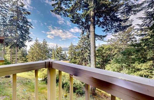 A serene Orcas Island setting awaits at this condo near Rosario Point, where you'll greet each morning with balcony views of the mountains and Cascade Bay through evergreen treetops. After a day of exploring, it's a place to spend your evenings reading by the fireplace or unwinding with a soak in the large tub.