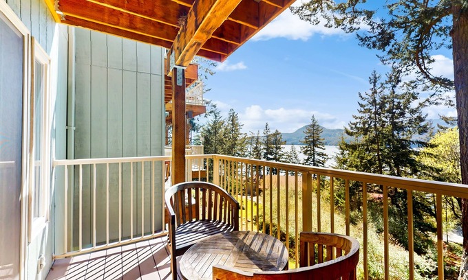 Find rest, relaxation, peace, and privacy at this inviting Orcas Island condo, beautifully situated near Rosario Point. Wake up each morning and step out onto your balcony to take in a view of evergreen treetops, the waters of Cascade Bay, and the gorgeous, mountainous landscape.