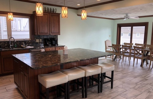 On the second floor you have an open concept Kitchen/dining/living space. Adorned with new granite counters, a massive kitchen island, and stainless steel appliances, the chef's kitchen is truly one of the many gems of this house. A 13 Ft. kitchen table holds up to 16 people with plenty of elbow room. The massive 5Ft by 8Ft granite island holds 6 stools which is a great spot to sit and either eat, help cook or just watch the cook in action.
