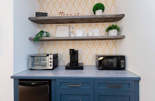 The suite has a microwave, Keurig coffee machine, and a mini fridge for a quick meal. The suite does not include a kitchen, bar sink, or separate living spaces.
