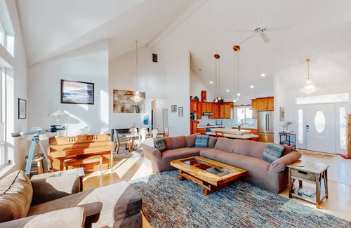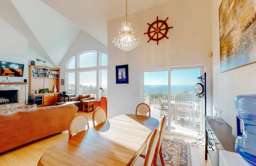 Whether you're planning a summer beach vacation or a whale-watching excursion in winter or spring, this ocean view home just outside of Newport offers a bright, comfortable home base and a wealth of at-home entertainment for all ages. Beautifully situated on almost two acres of land overlooking the water, this home features an expansive grassy lawn where you can play softball and soccer, a large deck with a view of the ocean, and a private hot tub and firepit to warm you after days spent on the beach. Inside, you can use the telescope to spot whale spouts in the distance, cozy up with a book in front of the wood-burning fireplace, and prepare hearty homemade meals using the kitchen's stainless steel appliances. At night, you'll have six TVs to choose from for movie night, as well as a home game room with Ping-Pong, billiards, a dart board, and a Wii gaming system.