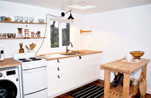 Listen to the babbling of nearby Ten Mile Creek or the ocean waves which will lull you to sleep in the luxurious king bed. Relax on the sofa and enjoy the soothing and sophisticated decor. The open floor plan invites you to enjoy conversation and cooking together where you can whip up a favorite meal or gather take out at one of the coasts' fantastic restaurants.