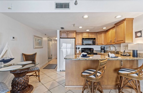 This sixth floor condo features a fully stocked kitchen complete with an oven, stove, microwave, full-sized fridge and breakfast bar. The kitchen flows into an open-concept living space with a flatscreen TV, comfy queen sized sofa bed and a dinette set. Down the hall is a cozy Queen Bedroom as well as a full private bathroom with a hair dryer and complimentary toiletries for your stay.