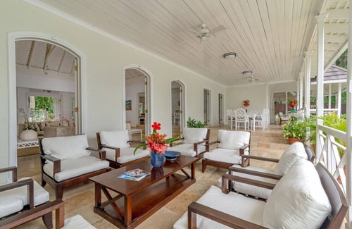 Eight Rivers is a charming house with a magnificent waterfront location. The Villa has a European style, decorated in calm contemporary colors. Walking through the lower level sitting area to double French doors that lead from the sitting room onto a long covered verandah, with outside dining on one end and a comfortable sitting area on the other.