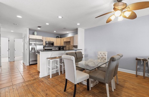 The townhome features spacious living areas, a well-equipped kitchen, and a game room with a pool table and Smart TV. The backyard oasis includes a pool, and plenty of lounging options, all surrounded by lush greenery. Upstairs, the primary suite boasts an ocean-view balcony, a luxurious bathroom, and a small exercise area, while other rooms provide comfortable accommodations for the whole family. Whether enjoying the beach or the backyard, Ocean's Edge guarantees an unforgettable experience.