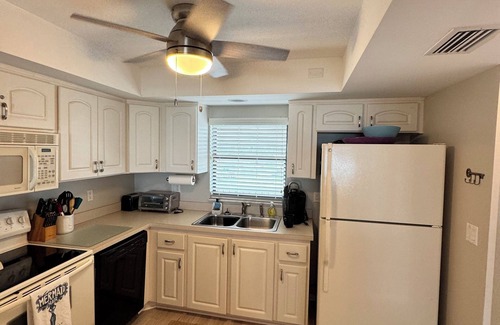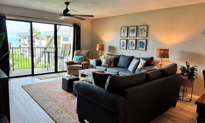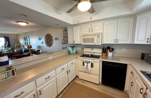 Ormond Beach is a wonderful condo complex with pool and lovely courtyard. This area is quiet and relaxing with a short drive to Daytona if you want more action. This unit is on the top/3rd floor, center unit for the best ocean view, clean and fully equipped kitchen, linens, beach chairs, etc. Master has king bed, 2nd bedroom has queen plus 2 twins (daybed/trundle) plus sleeper sofa in living room.