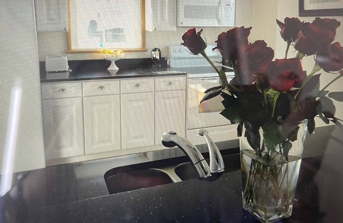 The kitchen is fully equipped and offers a nice view of the ocean as well.