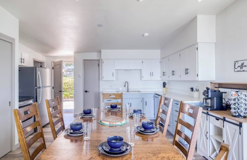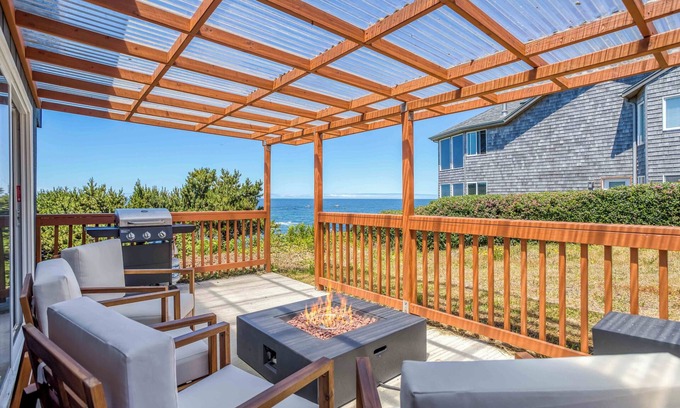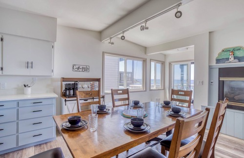 You’ll get the best of both worlds with a stay in Surfrider Beach House: the privacy of your own home with all the sweet amenities of the Clarion Inn Surfrider Resort, an indoor pool, sauna, and a path to the beach access. What a beach it is! Right next to Fogarty Creek Recreation Area, the beach at Surfrider features large rock formations for exciting beach exploration, tide pooling, agate hunting, and magnificent surf. Depoe Bay is famous for whale watching...which you can do right from your balcony! This completely updated home has several outdoor areas for enjoying the rock-studded beach below: an ocean-view side deck with a fire-table, seating, and barbecue, a west-facing sitting deck, a covered hot tub area that seats 4, and a gazebo for watching sunsets with a glass of wine in hand. Indoors, you’ll enjoy an ocean-view living room with ample seating on two sofas, a TV, and an inset gas fireplace. You’ll also dine with a view, adjoining a fully equipped kitchen with stainless steel appliances and all you’ll need to dine in.