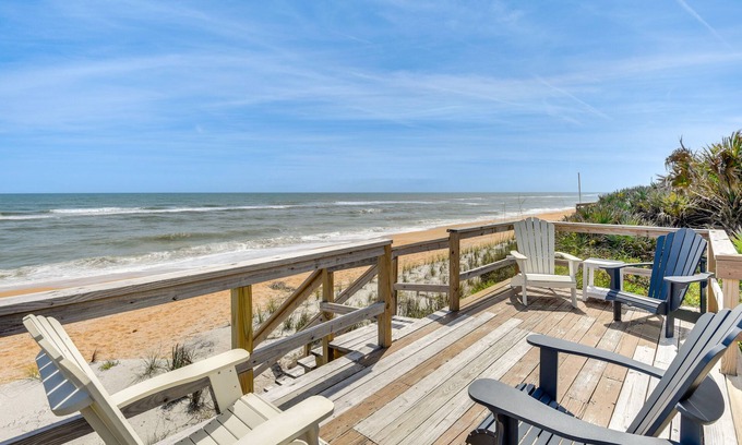 Book a memorable coastal escape at this quaint Flagler Beach vacation rental! With ample living space and a quiet oceanfront location, this 4-bedroom, 2-bath home is perfect for relaxing indoors or soaking up the Florida sunshine. Spend your days sunbathing on the private beach, biking on the Lehigh Trail, or fishing at the Flagler Beach Fishing Pier. Afterward, fire up the grill for a delicious barbecue and relax on the furnished decks. An unforgettable stay awaits!