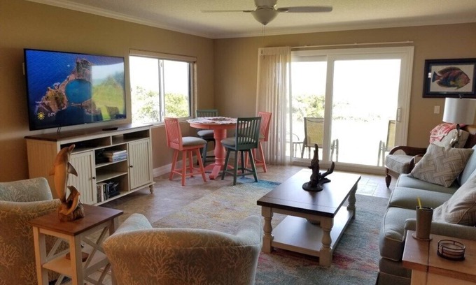 The spacious living area is the ideal place to enjoy a favorite movie or game. With plenty of places to sit and relax, you'll find our condo comfortable for the whole group.