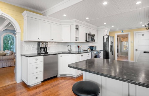 Adjacent to the dining room is a fully equipped sun splashed kitchen. The kitchen has a Bosch dishwasher, double door Kenmore stainless steel refrigerator with water and ice station built into the freezer door, LG - 6.3 Cu. Ft. Smart Slide-In True Convection Smooth Cooktop with 5 burners and range with EasyClean and Air Sous Vide, with top of the line Whirlpool microwave above. A two-seat breakfast bar and window bench is across from an undercounter refrigerator and small sink. Across the hall lies Bathroom 1: first-floor full bath with a shower and laundry equipped with high efficiency Kenmore Elite washer and dryer.
