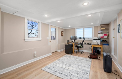 At the basement level you will find an office area with an all in one printer with a door out to the patio. Beach items are stored here for easy access outside from the office door.