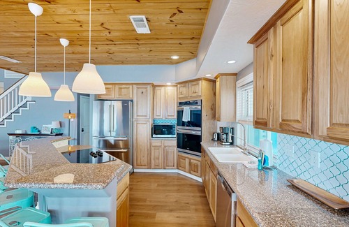 Sit on the balcony of Emerald Isle with amazing views and the sounds of the gulf! This luxurious home offers an open-concept living area with plenty of seating, and flat-screen TV in every room to allow for ample ways to relax and recharge. Cook up a quick meal in the fully equipped kitchen with granite countertops and stainless steel appliances after a long day on the sand. There is a dining room table for six, high ceilings, and wood floors throughout, creating an airy ambiance you won't want to leave. Be sure to head out to the wraparound deck and gazebo during sunset to see the colors of the sky change as the sun dips below the horizon!