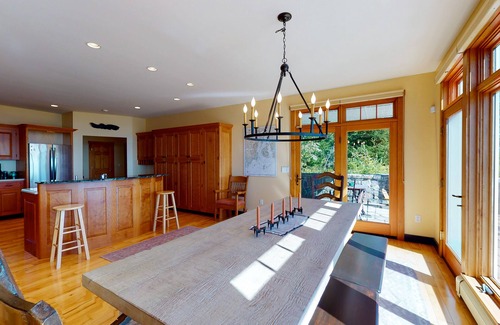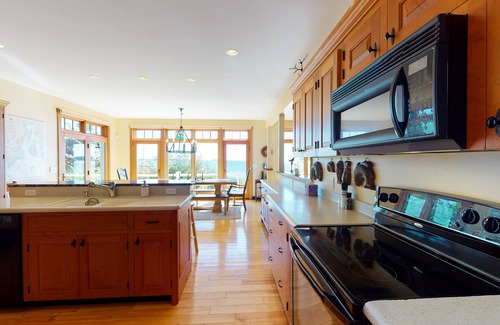 Inside, the main floor has a spacious family room with a fireplace and a large, well-equipped kitchen with a dining area to seat all of your guests. Both these rooms have access to the front deck via French doors. The high ceilings, complemented by the abundance of natural light, creates a homey ambience you're sure to appreciate. Upstairs, there are three bedrooms, two full bathrooms, a large game room with a regulation-sized pool table, a minibar, a cozy conversation area overlooking the water, and a multi-purpose room. Be sure to make your way through one of the bedrooms to the private, rooftop deck with a bistro set. Photos of the views from this elevated deck don't do it justice!
