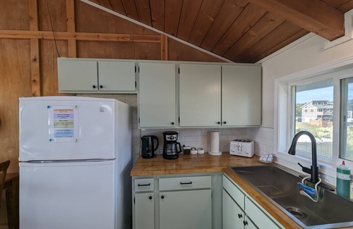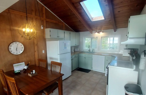 The upper level is an open floor plan - living room, dining and kitchen. Enjoy ocean views while cooking, eating, playing a board game or watching TV. The wood stove (wood provided) adds to the atmosphere on a winter coastal night.