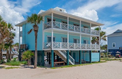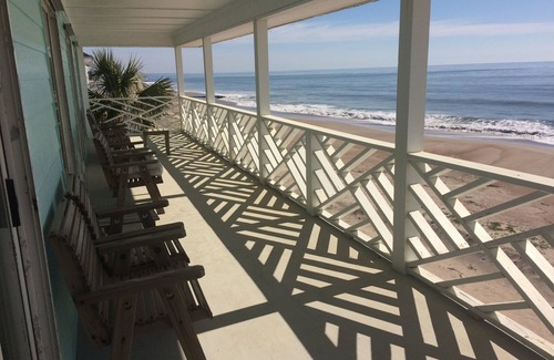 Comfortable living directly on the beach. Perfect beachfront location! 6 bedroom, 3 bath (1 King, 3 Queens, 2 singles and 1 twin-over-full-over-queen bunk) oceanfront vacation rental. Five of the six bedrooms are oceanview, with sliding glass doors out to porches with plenty of seating. Great Family Vacation gathering spot. Enjoy this newly renovated showplace with gorgeous ocean views. This is the South at its most charming, a premier beach experience. Steps away from a wide sandy beach. 4 covered porches with over 1,000 sq ft of outdoor living space. Ceiling fans, outside charcoal grill and enclosed outdoor shower with changing room. Please: No Smoking in the house. No House Parties! New 55" 4K UHD television! All bedrooms have TV's. Bunk room has desk and chair for remote work/study with very fast Internet. Weekly Rentals are on a Saturday to Saturday basis. Maximum occupancy is 15.