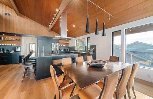 The fully stocked chef's kitchen is equipped with Bosch appliances including an induction cooktop, 48" side-by-side refrigerator, 30" oven, 30" speed oven, two large sinks and two dishwashers. A separate coffee station is equipped with a professional automatic coffee/expresso machine (Jura X8) and a stand alone ice-maker. The open kitchen configuration allows for multiple cooks to interact with the entire gathering and to enjoy the views.