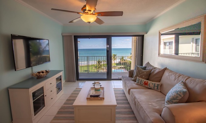 Oceanfront getaway! Perfect for families or romantic get away. Beautifully updated 2-bedroom, 2 bathroom penthouse unit just steps to private pool and beach. The pool is heated year-round, and there are 2 convenient bathrooms. This condo has all the amenities you need for a perfect vacation. Fully stocked kitchen, new beds and bedding throughout. All linens provided, including beach towels, beach chairs and, of course, the million-dollar view!! Walking distance to ocean-front shops, restaurants, and a great park with an oceanside restaurant next to the building. There are many local attractions, including museums, a theater, farmers market, Disney resort 3 miles away, fishing, golf and tennis, and much more! With an ocean view from every room, you will be able to unplug and relax! Sit outside on the balcony overlooking the pool and ocean and enjoy the simplicity and beauty of Vero Beach!