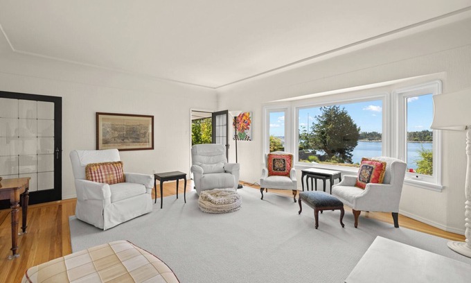 This exclusive oceanfront home is found on one of the most scenic roads in Victoria. This beautiful retreat has a three quarter acre garden that is maintained the year around. It is a 2200 square foot three-bedroom/two bathroom home with kitchen, dining room, living room den and two working fireplaces. It is close to all amenities as well as to the university. There is ever-changing scenery in the bay with sailboat racing, kayaking and wildlife.