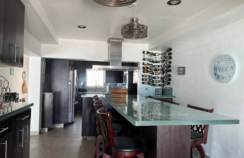 This entire oceanfront home in paradise includes 3 bedrooms plus an office with two twin beds perfect for kids. Each bedroom has a full en-suite bathroom. The open concept kitchen has a large breakfast bar perfect for gathering around with top of the line appliances. The house also features a large living and dinning area with the best ocean views in Nassau. You will also enjoy your own private pool and pool deck perfect for lounging in the warm tropical sun. There are stairs located between the houses that allow access to the ocean in front of the complex for snorkeling or for a dip in the ocean.