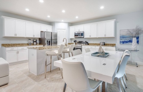 Heading downstairs in the both units you'll find the half bathrooms, kitchens, dining areas, and living rooms. The kitchens comes fully stocked for all your cooking needs and overlook the dining areas. The living rooms include comfortable furnishings, large smart TVs, and access to the patios. The patios include outdoor furniture and gas grills. You can also use the backyard to go between both units and feel free to spread out enjoy one big yard space between the two units.