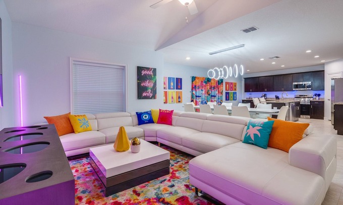 In the first unit, everything was designed with entertainment, fun, and family time in mind. The garage has been fully converted into a sprawling gaming center. Please note there is not air conditioning in this one space as it is a garage. Included in this space is a bright, leather sectional, large Smart TV, pool table, giant Connect Four, Wall Scrabble, and retro Pacman arcade game. A colorful array of LED lighting lines the entire space to create an amazing atmosphere when the main lights are turned off. Make memories with the whole group in this fun gathering space!