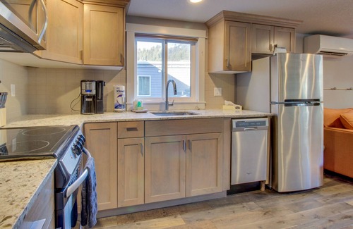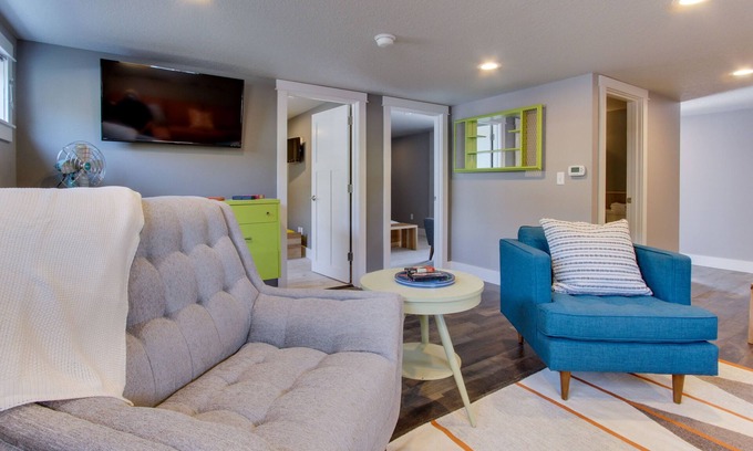There are two bedrooms, each with a queen bed and an attached bathroom. There’s also a sleeper sofa in the living room along with an additional half bath.