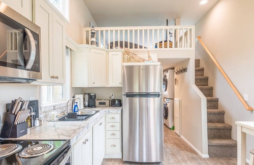 The home is located within the Diamond Point neighborhood, a peaceful and charming area. You will find upon entering the driveway that there is ample parking for up to two vehicles or two trucks and a trailer. Finding reliable internet out on Diamond Point can be hard. Luckily, we have Starlink internet service, providing us with just about 400mbs per second. Some of the fastest wifi you will find! Outside, you can find outdoor seating by the fire pit with views out to the ocean and a full-size covered patio with a barbeque. The spacious tiny home is just under 400 sqft and can accommodate four people comfortably. Upstairs in the loft, you will see that the ceilings are a little lower but can still accommodate adults. There are two twin beds, along with a nice lounger chair and a mounted TV. Downstairs, you can find in the back bedroom a full-size bed and plenty of clothing storage. The living room/kitchen is the main highlight of the home and can accommodate a nice meal or a good movie, the views are phenomenal.