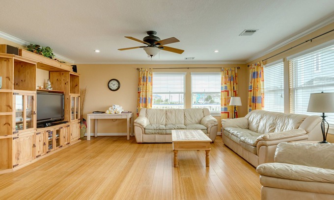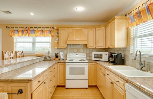 Escape to this stunning four-bedroom home and enjoy a vacation to remember here in Galveston! Featuring a flat-screen TV, dining room table with seating for six, and a full kitchen equipped with all your major appliances, you will feel right at home while away. After a day on the beach, relax on the covered deck or the downstairs patio boasting amazing views of the ocean! On warmer days away from the beach, guests can escape the heat and take a dip in the shared pool!