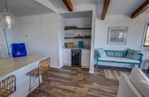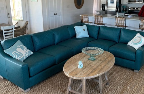 Living Space: The bright, open-concept great room, dining area, and kitchen create an inviting atmosphere. The kitchen, equipped with new quartz countertops and stainless steel appliances, features a bar with a sink that overlooks the great room—perfect for family meal prep. The large island allows everyone to join in, and it’s an excellent spot for quick breakfasts after your morning beach walk. The dining table accommodates 10, and the bar seats 4.