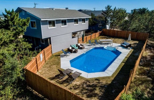 Extras: Enjoy a private pool (17 x 36), wireless internet access, cornhole boards, and outdoor furniture made from high-quality polywood. The pool area features tall boy chairs for easy access and a fun fish-shaped dining table, along with 4 matching lounge chairs for sunbathing.