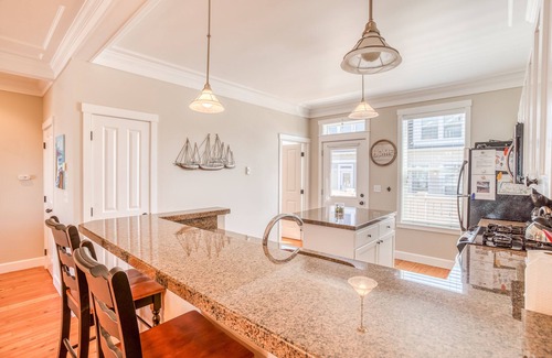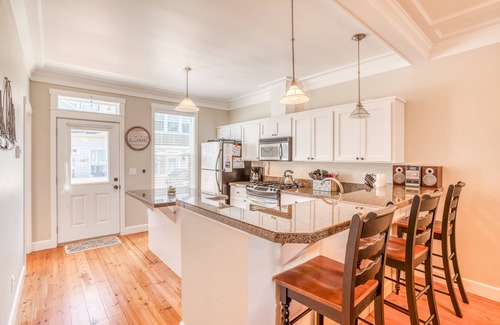 This attractive townhome invites you to an upscale, relaxing stay in nostalgic Bella Beach, a neighborhood of Cape Cod-style homes with its own beach access, playground, park and French café. Walk up the golden pine staircase to the second-story and the clean, open vibe of the great room, fronted by a large balcony deck with a dining table for six, Adirondack rockers and sounds of surf and ocean breezes from the Pacific across the street. The living room has suede microfiber sofas, a gas fireplace and a huge flat screen Smart TV with Youtube subscription/BluRay DVD. The trestle dining table seats eight, with three additional chairs at the elevated granite breakfast bar. It’s easy to serve your guests from the beautiful, fully equipped contemporary kitchen with its gas stove and island for added counter space. A door out back leads to another balcony deck with a gas barbecue. When it’s time to rest and retreat for the night, two gorgeous bedrooms on the third floor have luxury bedding and lots of light. You can watch the ocean from the king bed in the front bedroom suite; the back suite has a short twin tucked into the eve, making a cozy spot for a child to sleep. The ground level has a queen suite, which puts it close to the hot tub on the front porch. Walk a half block to the neighborhood beach access for miles of beachcombing on gently sloping sand. Your home is also minutes to a brew pub, spa and golf at Salishan, exquisite dining at the Side Door Café and Restaurant Beck, and minutes from whale-watching at Depoe Bay. Newport and Lincoln City are less than a half hour away, making this a versatile location for all sorts of Central Coast adventures!