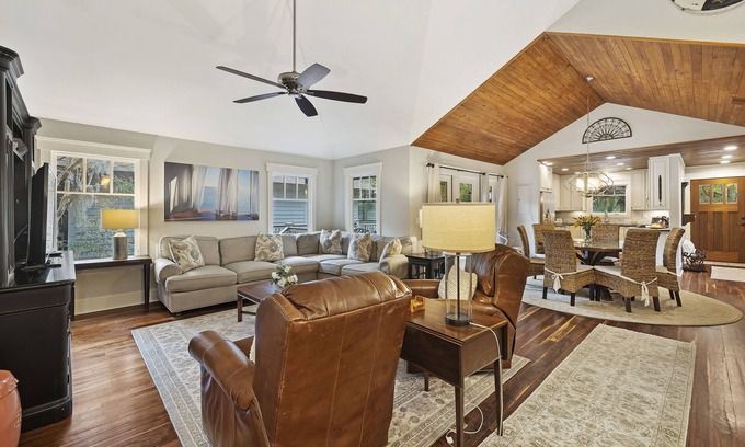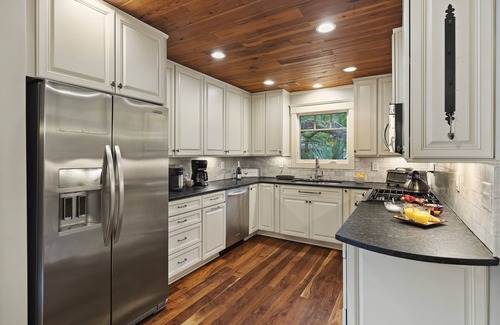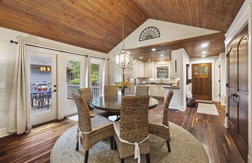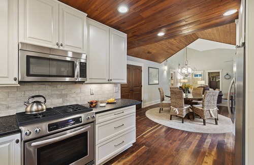 Entering the cottage, you'll be impressed by the expansive open floor-plan and gorgeous wood-plank vaulted ceiling. The remodeled kitchen features custom cabinets and countertops, tile backsplash, and modern stainless steel appliances. A triple glass door in the dining room opens to the back deck - the ideal place for grilling, dining al fresco, or relaxing with the sounds of the ocean nearby.