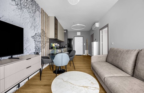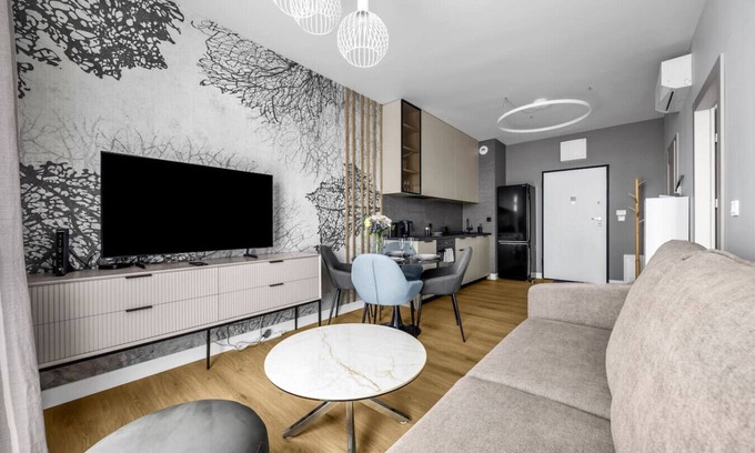 The apartment is situated just 750 meters from the nearest train station, 2.8 km from Blue City Mall—a major shopping and entertainment center—and only 6 km from Chopin Airport, ensuring easy access to transportation and amenities.