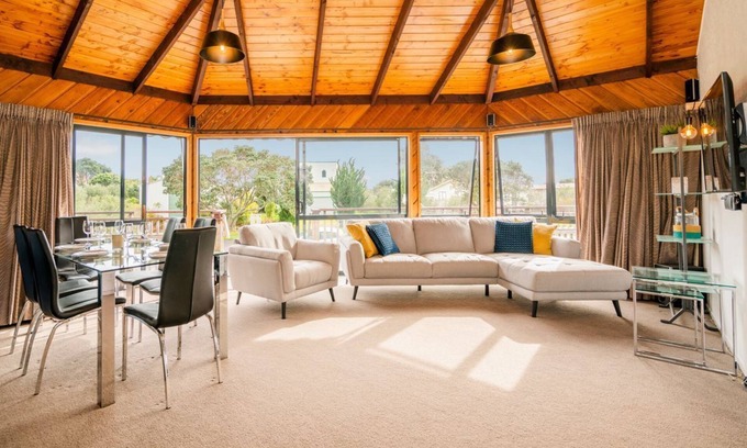 Uniquely built in the shape of an Octagon, Octagon by the Beach is located less than 100m from beautiful Matarangi Beach and 50m from the Village Green and playground. 5 minute walk to the local shops and cafe, and a 10 minute walk to the gold course. With wrap-around decks you can chase the sun all day.