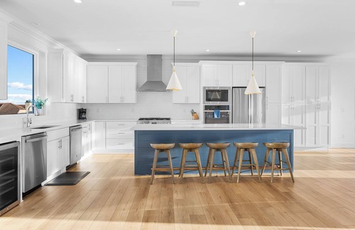 THE KITCHEN - The large chef’s kitchen has two refrigerators, two ovens, a 36” five burner gas range, two dishwashers, a built in beverage center/wine cooler, plenty of cabinets and storage and a ten foot island with stools. This kitchen is fully stocked with ample dinnerware, glassware, kitchen gadgets, appliances and everything you could need to cook for a large group – even spices! Eating indoors? You have TWO ten seat dining tables with spectacular ocean views to complete your dining experience. And, a built-in window seat with ocean views.