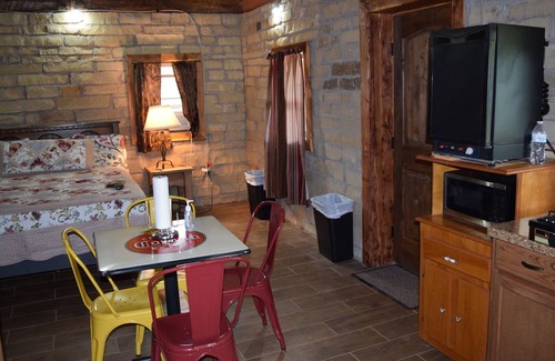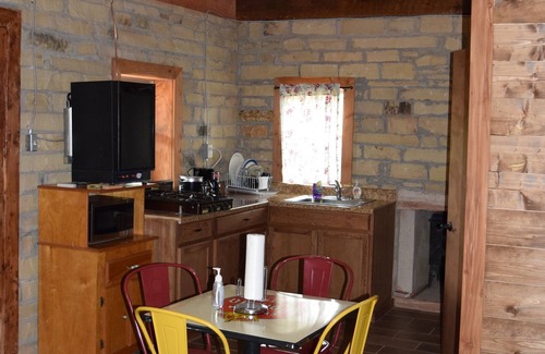 Note: There is no A/C at this cabin. There are security cameras at the main house for monitoring the pool for safety reasons. This cabin needs 48 hrs of advance notice before you book. Or warm it up during the cold. That is because the inside wall is made of rock, and takes a while to cool off or heat up. You will have to operate the wood stove to keep warm. This cabin is for the poets among us. Wonder what it would be like to be off-grid? Isolated from the world? Get your electricity from the sun, your heat from a wood stove? Propane hot water, and propane stove. No signs of civilization from this cabin. No lights at night. No sign of mankind from the cabin. No TV. Quiet. Coyotes call at night, hoot owls from the creek. You are alone. Isolated. Stars illuminate your imagination, as you live at the edge of the woods. Catch your dinner in the pond. Your water from a solar well. A rock cabin, timber frame trusses. Nature trails from the cabin take you through the pastures and to the ponds. But no comforts are spared as your luxury stay gives you a taste of self-sufficiency. Built to show my children and my friends that we don't have to have a mortgage. We don't need the electric company or the bank. We can build a structure that won't blow away, won't burn, and won't rot. No need for insurance. Built to last 400 years at least. Planting seeds in the minds of my children that they don't need to play the game, and enslave themselves to debt. They can grow their own food, and build their own home. They can live off grid if they want. This cabin is an example.