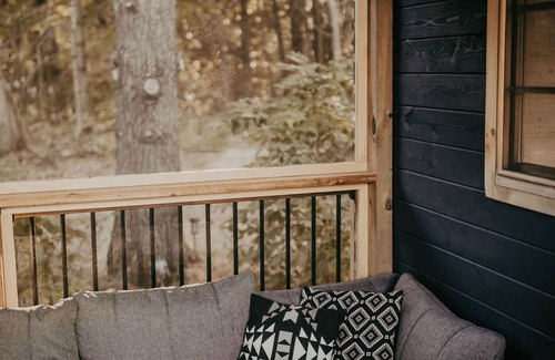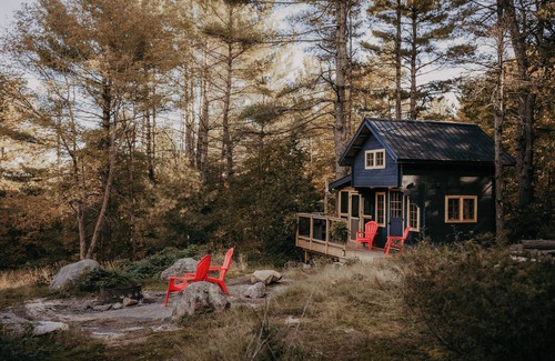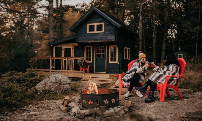 Nestled atop a small hill amidst a canopy of trees, this chic 100 sqft "bunkie" promises an off-grid "glamping" experience with no electricity, running water, or wifi.