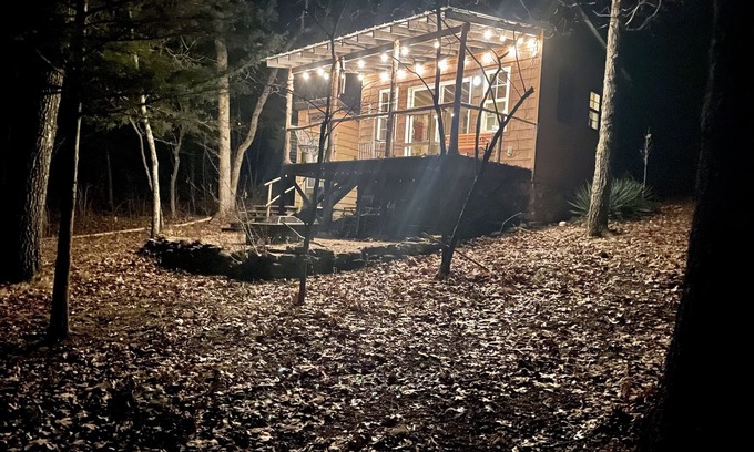Come stay at this Tiny Cabin on riverfront property situated on the Niangua River. Perfect location for fishing or hike our 80 acres of beautiful trails, sit by our natural waterfall or a quick walk into Charity Conservation or Goose Creek Conservation Area for hunting or wildlife watching. This studio cabin has a rustic boho vibe. Sit by the fire pit or nature watch on the deck. The wet weather waterfall is a short two minute walk from the cabin, then follow the bluff to the rivers edge