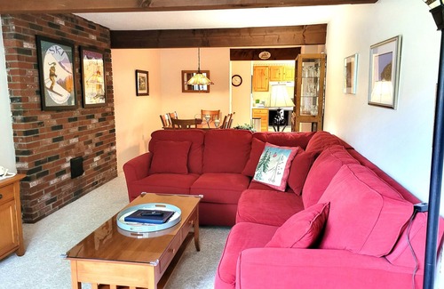 This is a two bedroom condo with air conditioning, that is located on the ground level of the building, it has a walkout to the back lawn and is near our tennis courts and pond. The unit condo will sleep up to 8 people with a queen bed in the master bedroom, 2 full beds in the guest bedroom and a queen sleep sofa in the living room. The unit has air conditioning in the master bedroom only. As with all of our 2 Bedroom Condominiums it has a fully equipped kitchen, living room, dining area, and 2 private bathrooms. This is a Dog Friendly condo for travelers, subject to fees.
