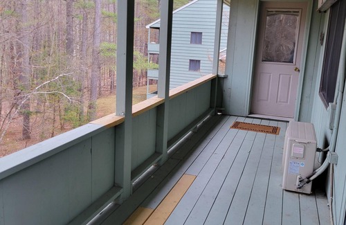 This is a Penthouse unit, a two bedroom condo with an upstairs sleeping loft and air conditioning, that is located on the top level of the building and a short walk to the Clubhouse Amenities Building. The unit sleeps up to 10 people with a king bed in the master bedroom, a queen bed in the guest bedroom, a queen bed and 2 twin day beds with twin trundle beds in the loft. The unit has 2 mini-split air conditioning units, one in the master bedroom and one in the loft area. There are two private decks in this unit; one on the main floor looks out to the forest, and one upstairs with a view of the property. As with all of our Penthouses it has a fully equipped kitchen, living area, dining area, 2 private bathrooms and all the linens. This is a Dog Friendly condo for travelers, subject to fees.